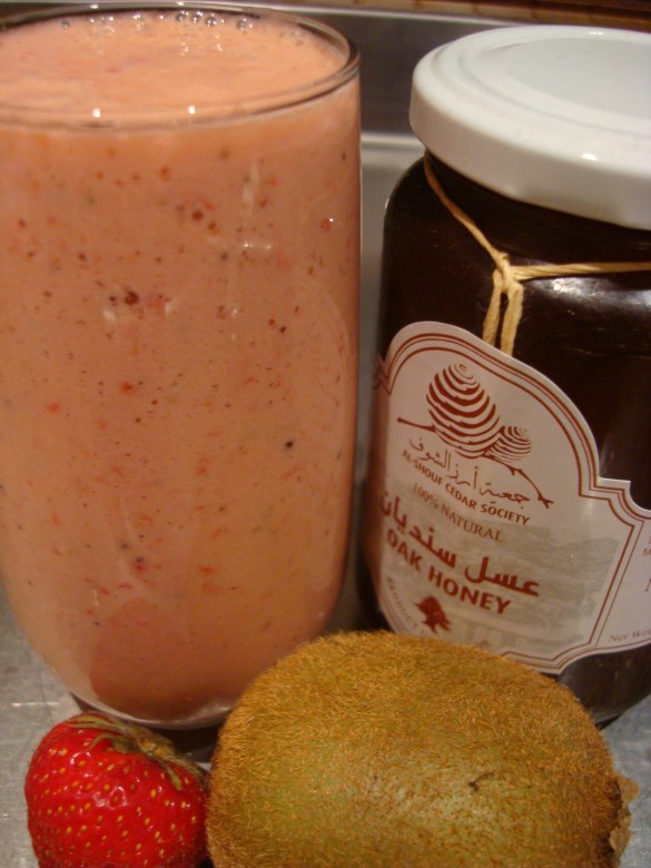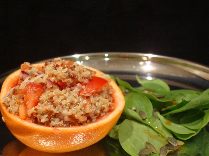 On one visit I very much liked a simple quinoa salad she prepared with grapefruit and which I’ve adapted here by adding flaked smoked mackerel fillets (you can leave them out to make it vegan). I used red and white quinoa because it was what I had in the cupboard, but black quinoa would make it far more dramatic.